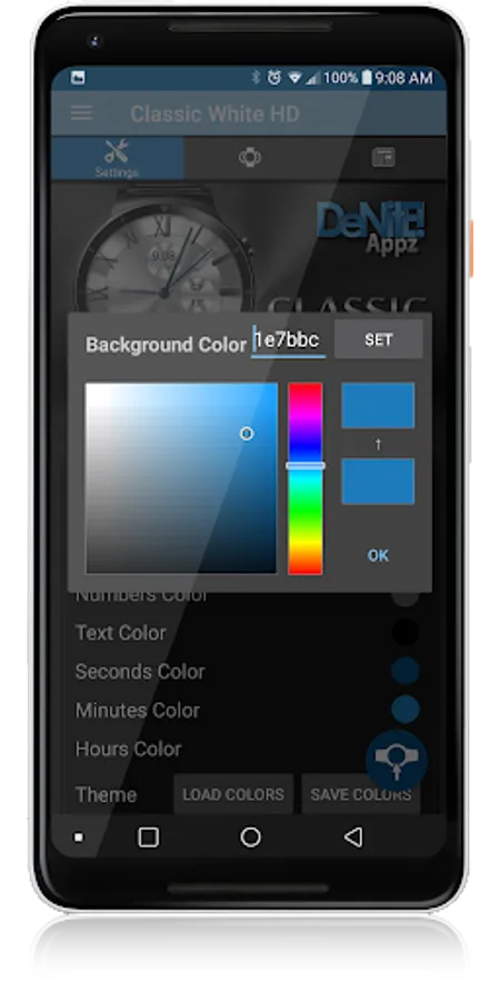✔ Color picker to select any color you like for the background, clock hands, text, & numbers