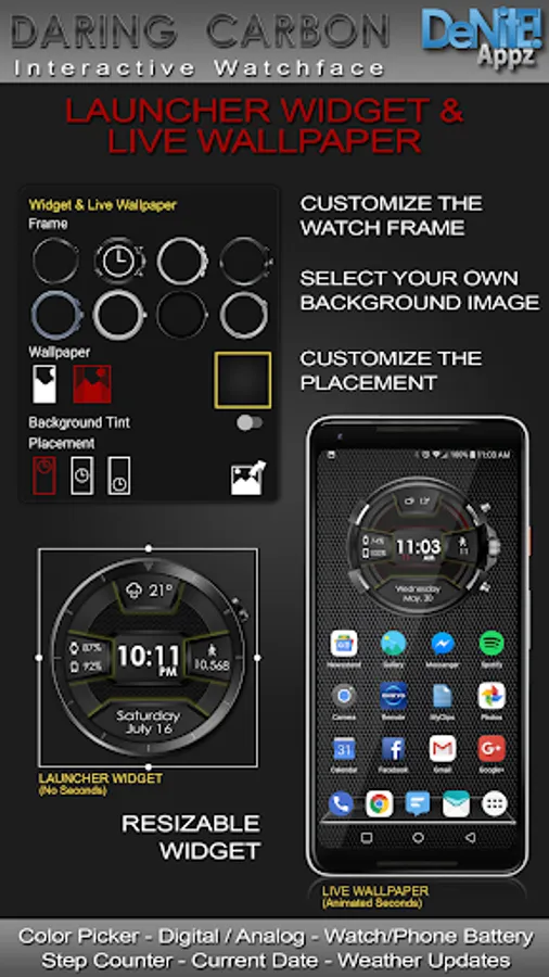 This completely customizable interactive HD Wear OS Watch Face, Clock Widget & Live Wallpaper brings a classic elegance to your wrist and Launcher. Features include custom complications, battery levels, weather conditions, step counter, color picker & date information. A settings app will also be installed on your mobile device to configure the watch face for any look you desire. Select any color and create a completely custom look for yourself! Don't have a Wear OS watch? No Problem! You can use the clock widget or Live Wallpaper on your launcher!