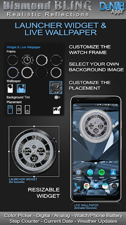 This completely customizable interactive HD Wear OS Watch Face, Clock Widget & Live Wallpaper brings a classic elegance to your wrist and Launcher. With realistic reflections that respond to the way you move your wrist or mobile device in real time you will be sure to catch the eye of every onlooker! Features include custom complications, battery levels, weather conditions, step counter, color picker & date information. A settings app will also be installed on your mobile device to configure the watch face for any look you desire. Select any color and create a completely custom look for yourself! Don't have a Wear OS watch? No Problem! You can use the clock widget or Live Wallpaper on your launcher!
