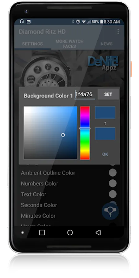 ✔ Color picker to select any color you like for the background, clock hands, text, & numbers