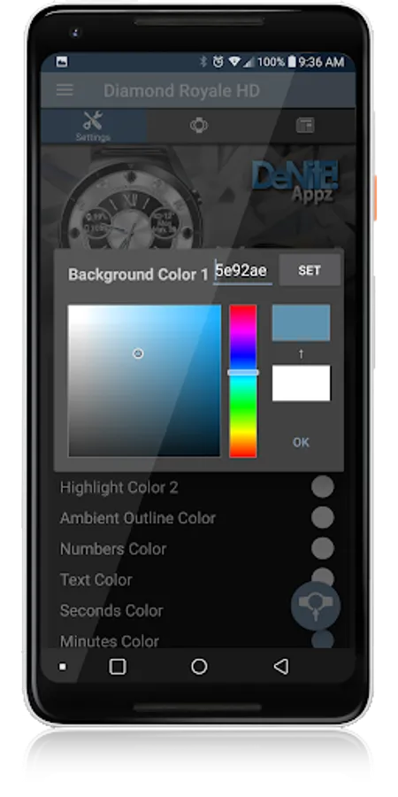 ✔ Color picker to select any color you like for the background, clock hands, text, & numbers