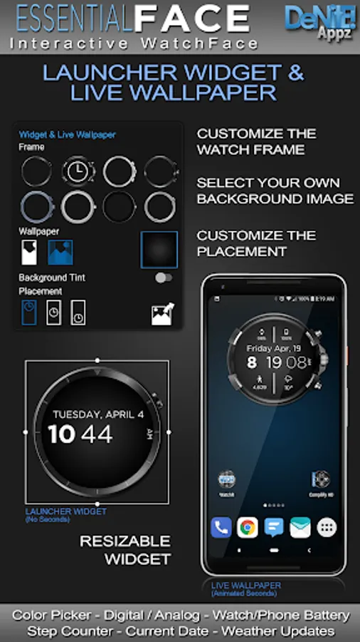 This completely customizable interactive HD Wear OS Watch Face, Clock Widget & Live Wallpaper brings a classic elegance to your wrist and Launcher. Features include custom complications, battery levels, weather conditions, step counter, color picker & date information. A settings app will also be installed on your mobile device to configure the watch face for any look you desire. Select any color and create a completely custom look for yourself! Don't have a Wear OS watch? No Problem! You can use the clock widget or Live Wallpaper on your launcher!