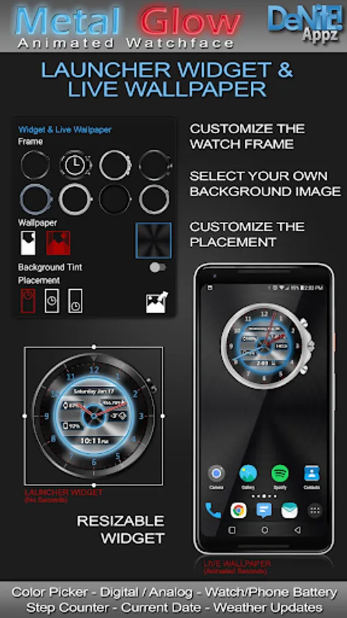 This completely customizable interactive HD Wear OS Watch Face, Clock Widget & Live Wallpaper brings a classic elegance to your wrist and Launcher. Features include custom complications, battery levels, weather conditions, step counter, color picker & date information. A settings app will also be installed on your mobile device to configure the watch face for any look you desire. Select any color and create a completely custom look for yourself! Don't have a Wear OS watch? No Problem! You can use the clock widget or Live Wallpaper on your launcher!
