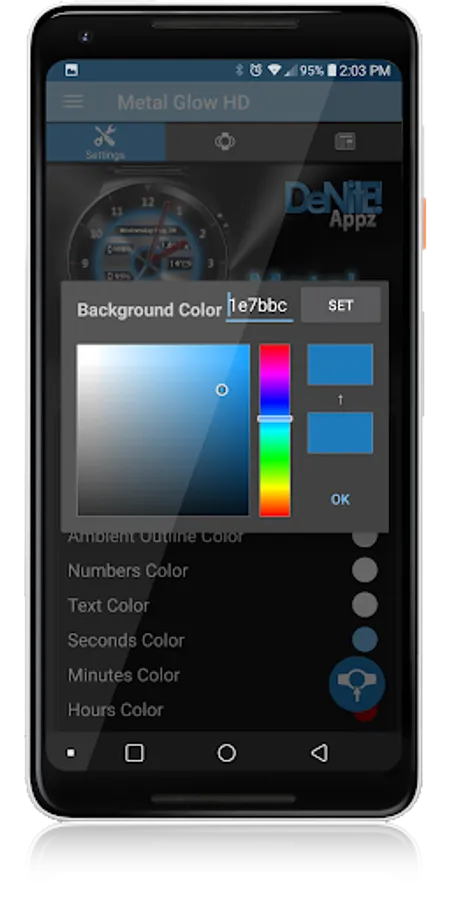 ✔ Color picker to select any color you like for the background, clock hands, text, & numbers