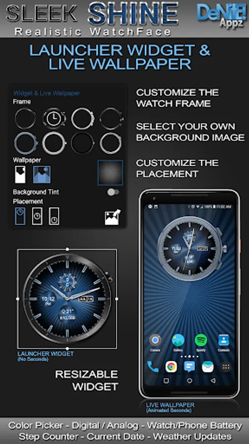 This completely customizable interactive HD Wear OS Watch Face, Clock Widget & Live Wallpaper brings a classic elegance to your wrist and Launcher. With realistic reflections that respond to the way you move your wrist or mobile device in real time you will be sure to catch the eye of every onlooker! Features include custom complications, battery levels, weather conditions, step counter, color picker & date information. A settings app will also be installed on your mobile device to configure the watch face for any look you desire. Select any color and create a completely custom look for yourself! Don't have an Wear OS watch? No Problem! You can use the clock widget or Live Wallpaper on your launcher!