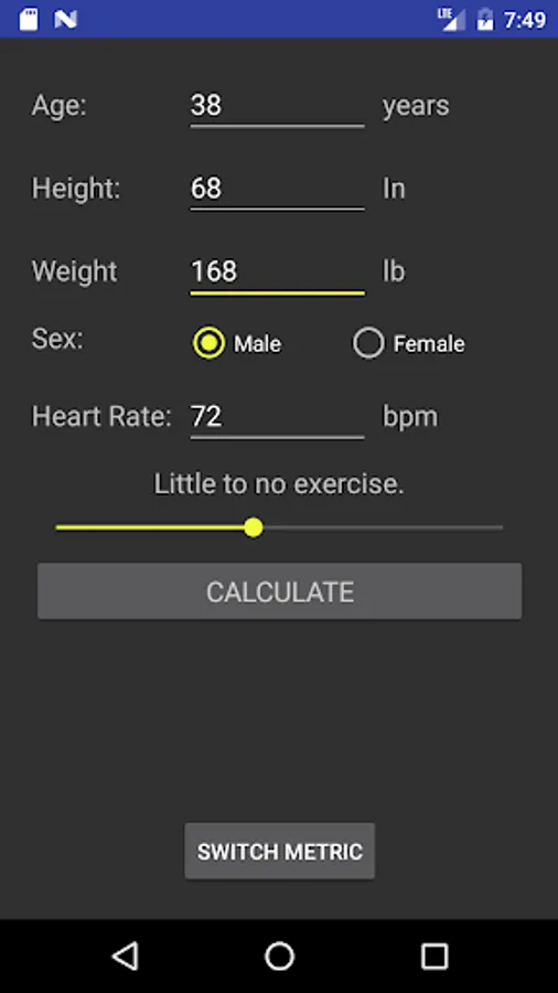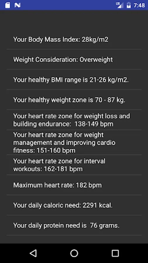 This application takes your age, height, weight, sex, activity level as input data and calculates your body mass index, ideal weight, heart rate zones for different types of workouts, daily caloric need and daily protein need. Calculations are based on formulas that are accepted in scientific research. Represented results of calculations are for information purposes only and they can not be considered as medical advice.
