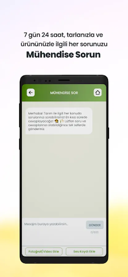 Tarlanız, yetiştirdiğiniz ürün, meyve bahçeniz, ağacınız, bağınızla ilgili tüm sorularınızı, konusunda uzman Ziraat Mühendisi ekibimize fotoğraf, video, ses kaydı ile veya yazılı olarak aktarabilirsiniz. Sorularınız en kısa sürede uygulama üzerinden cevaplanır veya uygulamaya kayıtlı telefonunuzdan aranarak bilgilendirilirsiniz. Deniz’den Toprağa uygulaması ile tarıma dair hiçbir sorunuz cevapsız kalmaz.