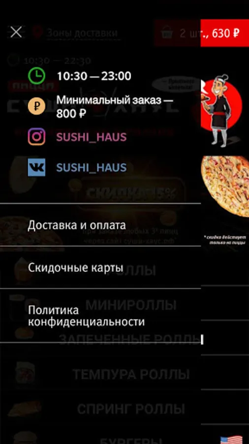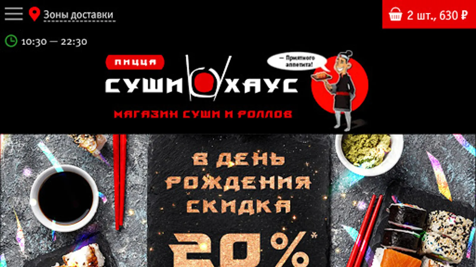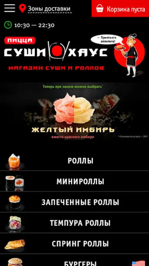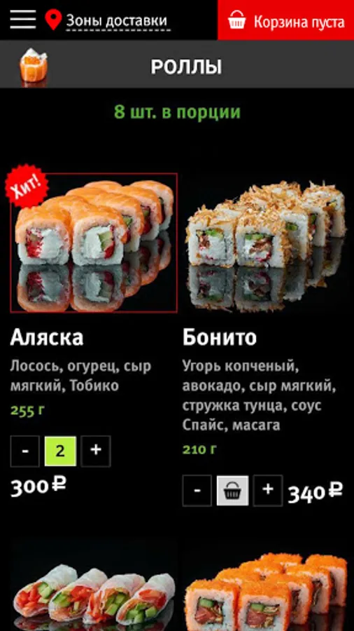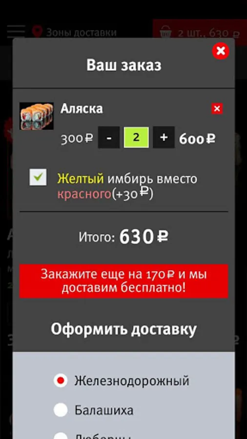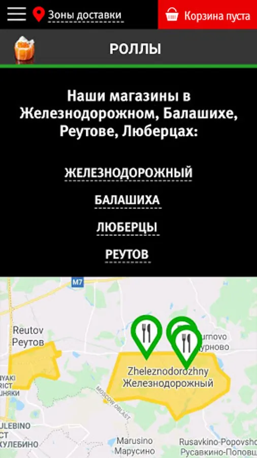We deliver sushi, rolls, burgers, pizza, noodles and rice, hot snacks, soups, desserts and drinks to residents of Zheleznodorozhny, Balashikha, Reutov, Lyubertsy. We are glad for your orders!