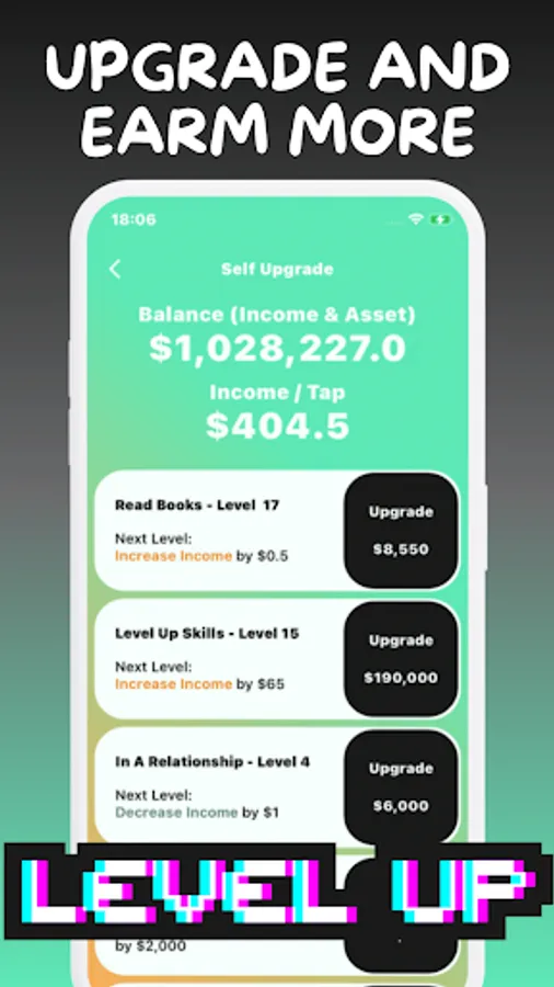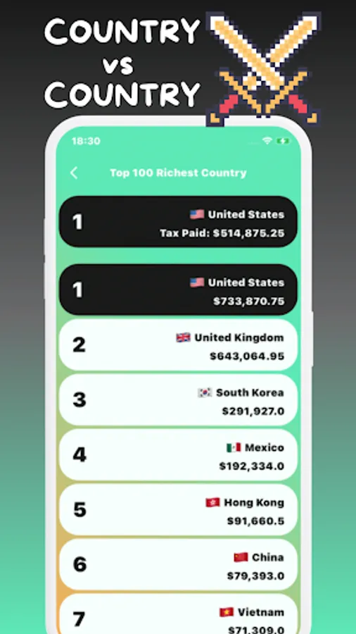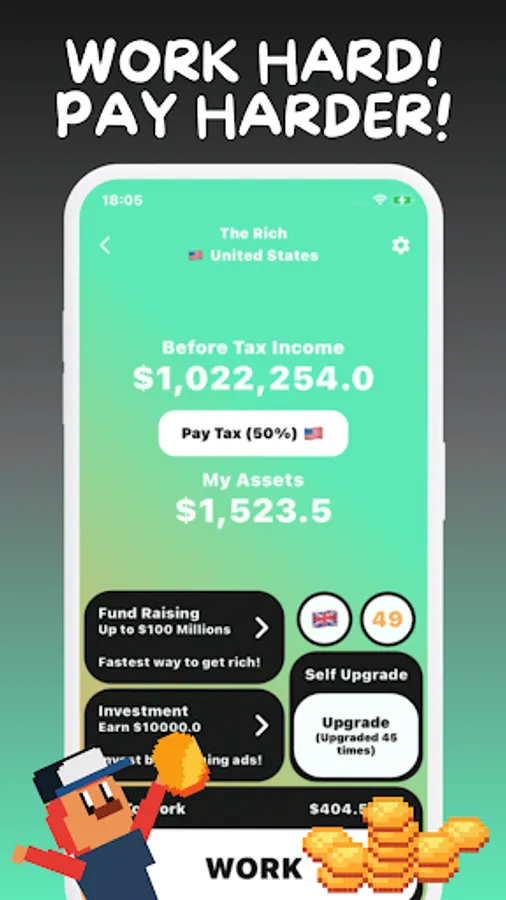 Tap to work in the game and pay taxes to your country. Upgrade yourself or invest in your businesses to increase your income. The more you earn, the more taxes you will pay to your country. Get yourself and your country rich now!
