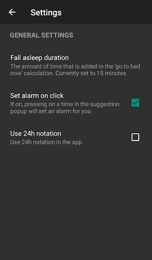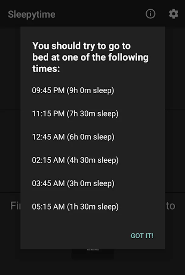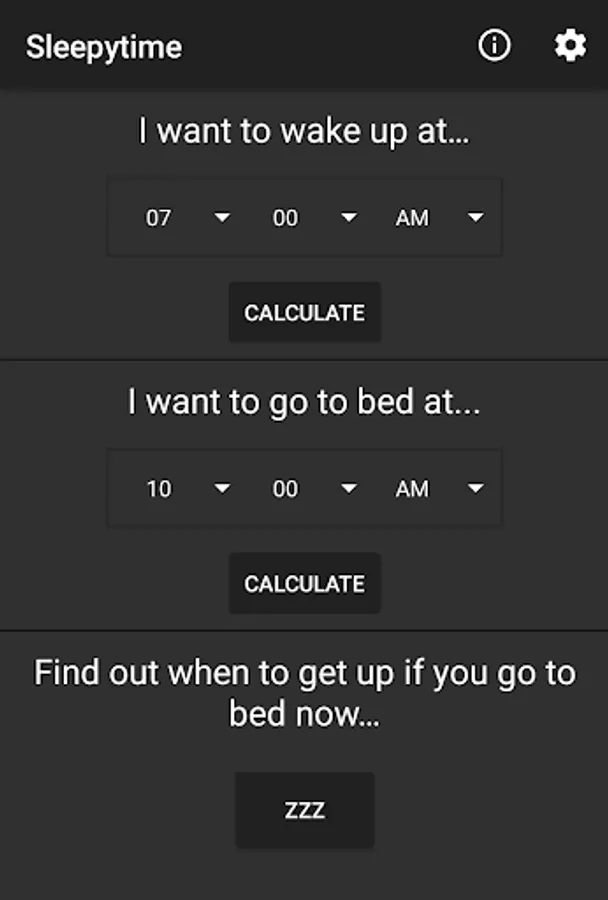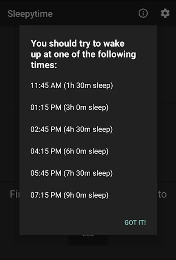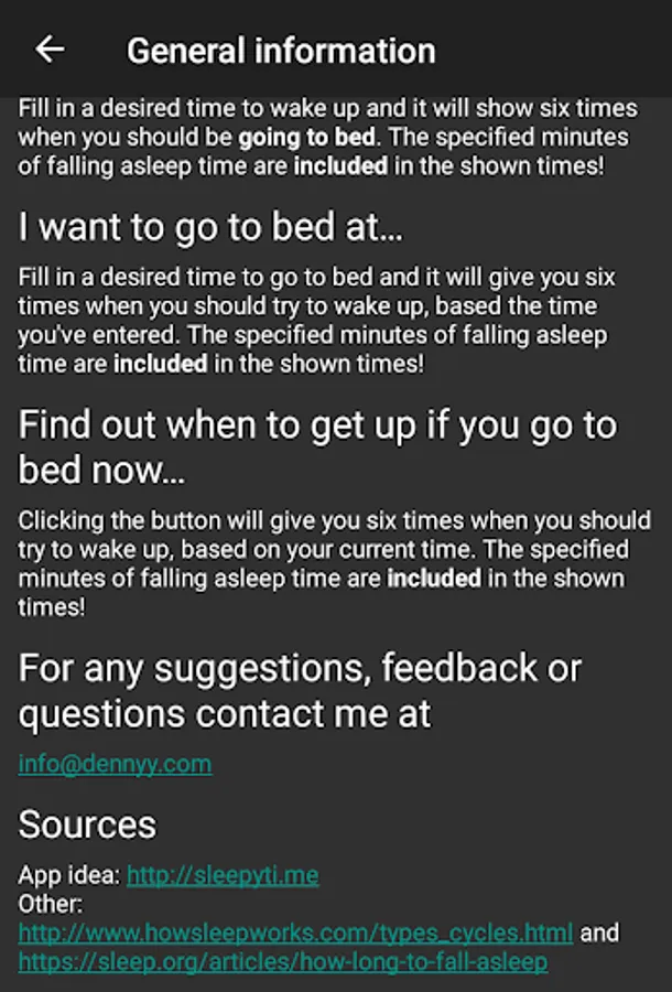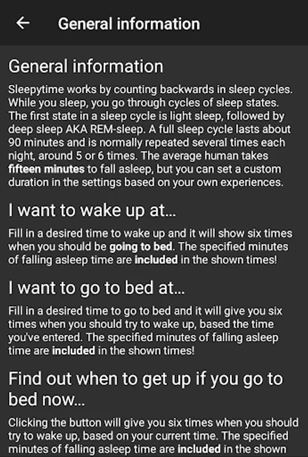 The app calculates the best times for you to sleep and the best times for you to wake up! It is based on sleep cycles of 90 minutes and calculates backwards. Waking up during a sleep cycle can make you feel tired, but waking after a cycle can make you feel more refreshed!