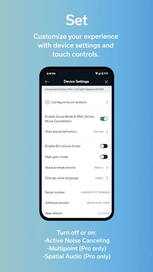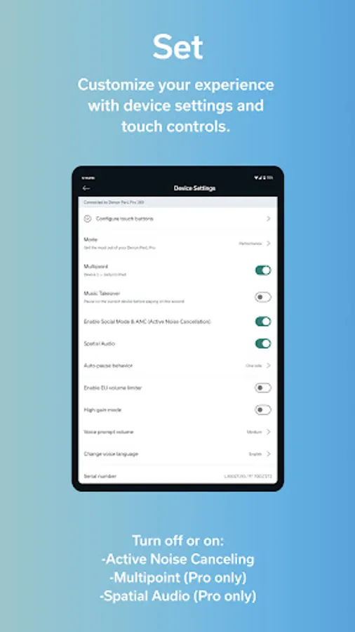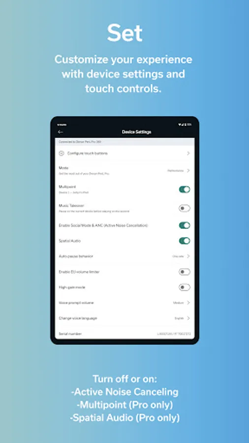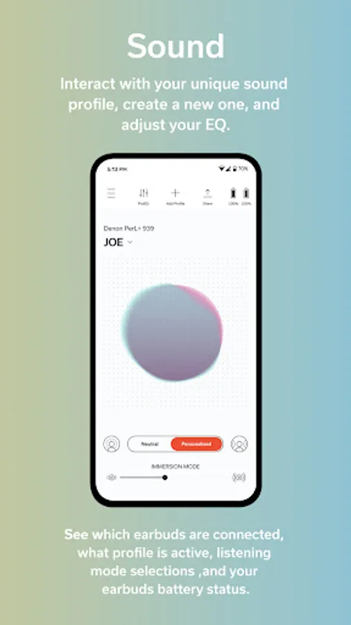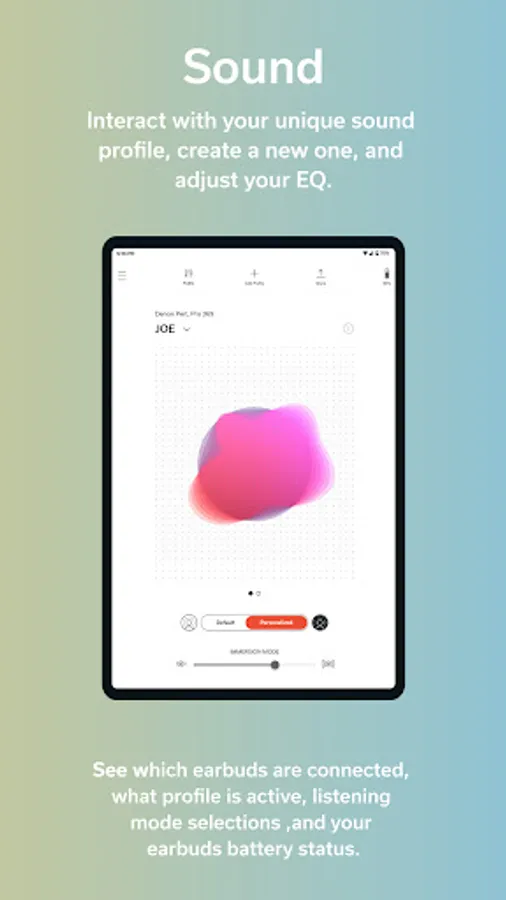 The Denon Headphones app lets you personalize your listening experience for Denon PerL Pro and Denon PerL earbuds featuring Masimo Adaptive Acoustic Technology. Create your unique hearing profile with a one-time measurement, and the earbuds sonically shape your music to match your profile. Easily switch between Noise Cancelling and Social Mode, adjust EQ and Immersion Mode. Get the ultimate personalized audio experience with the Denon Headphones app.