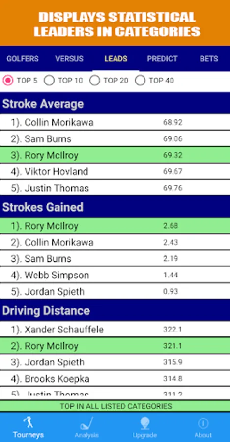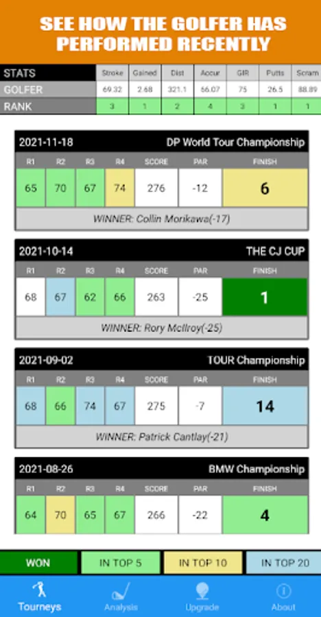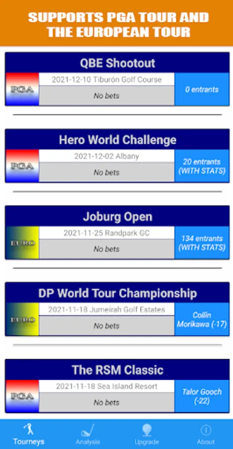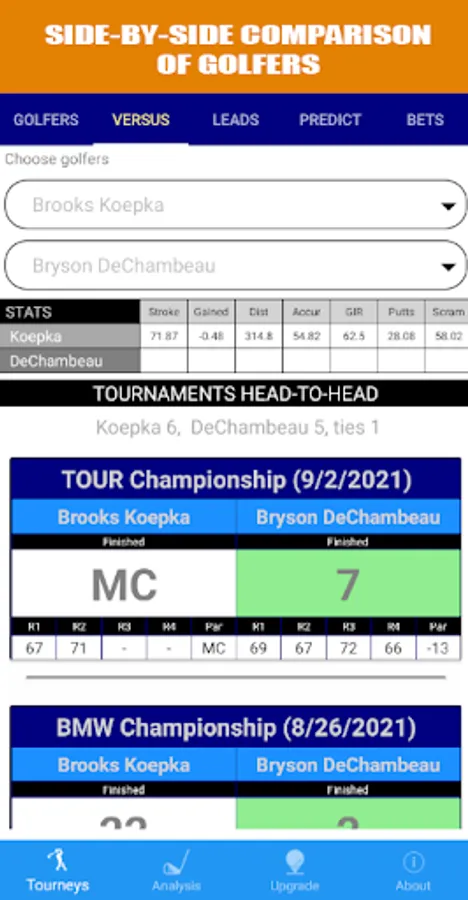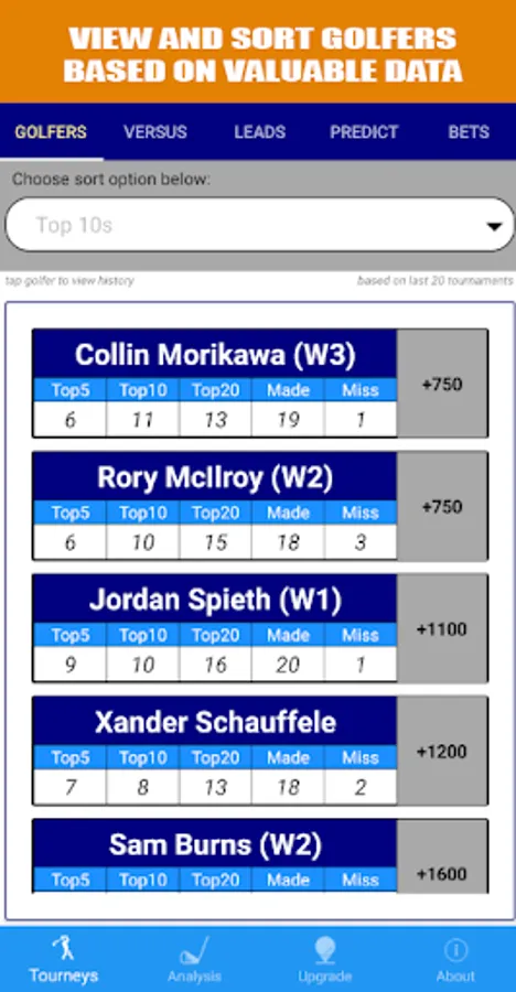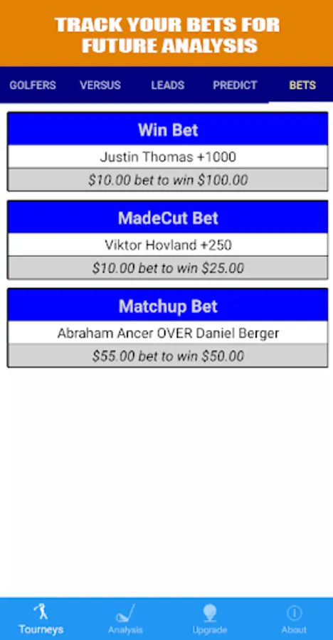 Betrax Golf provides the pro golf bettor with advanced handicapping tools. The app presents upcoming tournament information for the entered golfers, from recent performance to statistical rankings. But more than the information, the app's usefulness comes from the presentation of information to assist betting handicappers in their selection. We also have own our prediction tools based on our own in-house analysis.