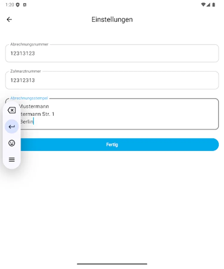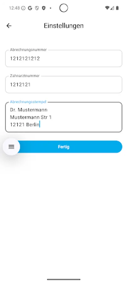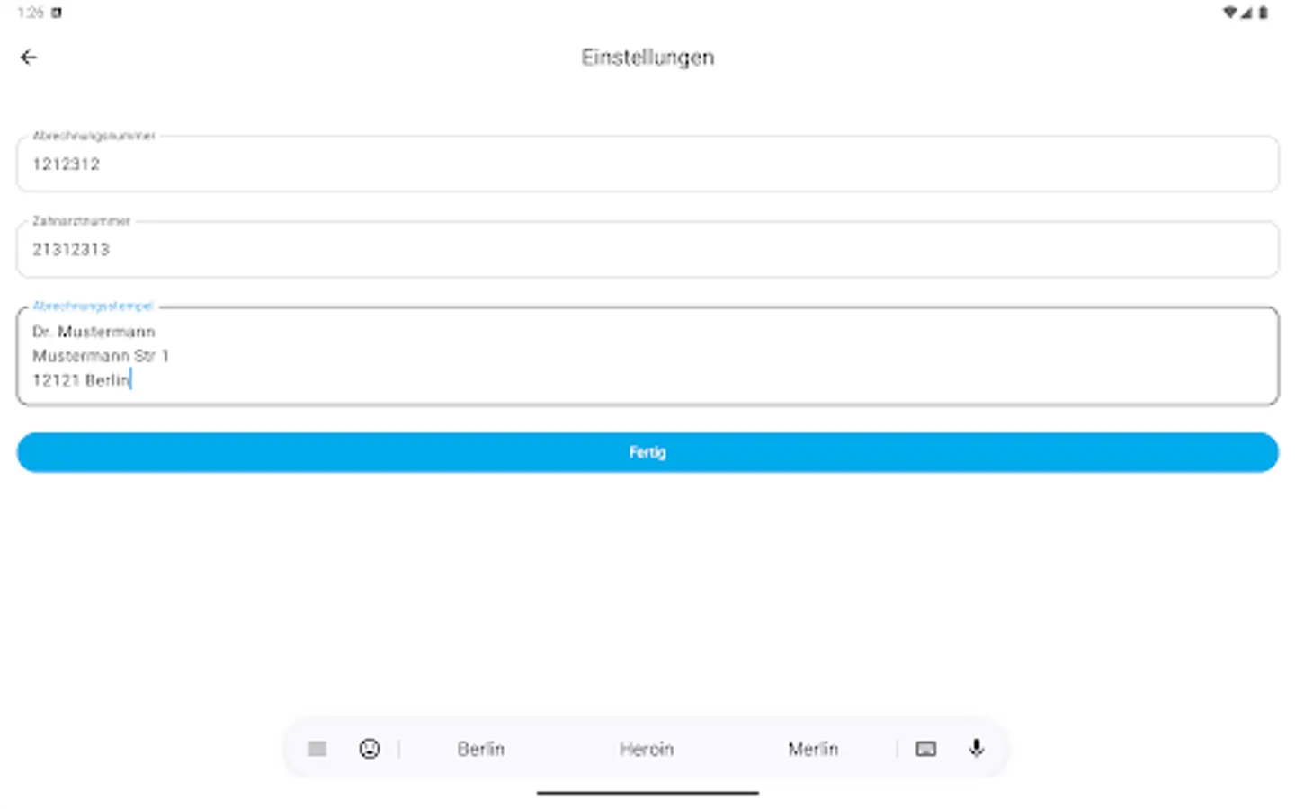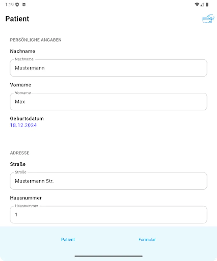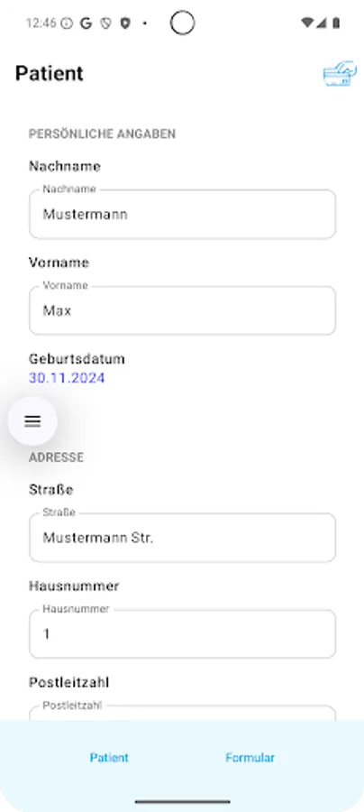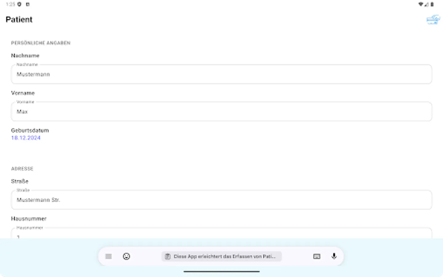 This app makes it easier to enter patient data, either manually or via a card reader with an electronic health card (eGK) inserted. Important note: The data entered will not be saved permanently. They only remain in the app for the current session. After the process is complete, no data will be stored on your device.