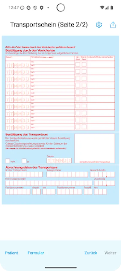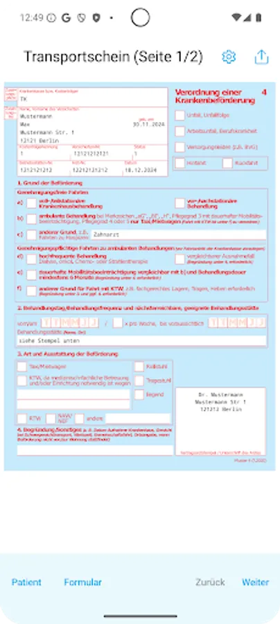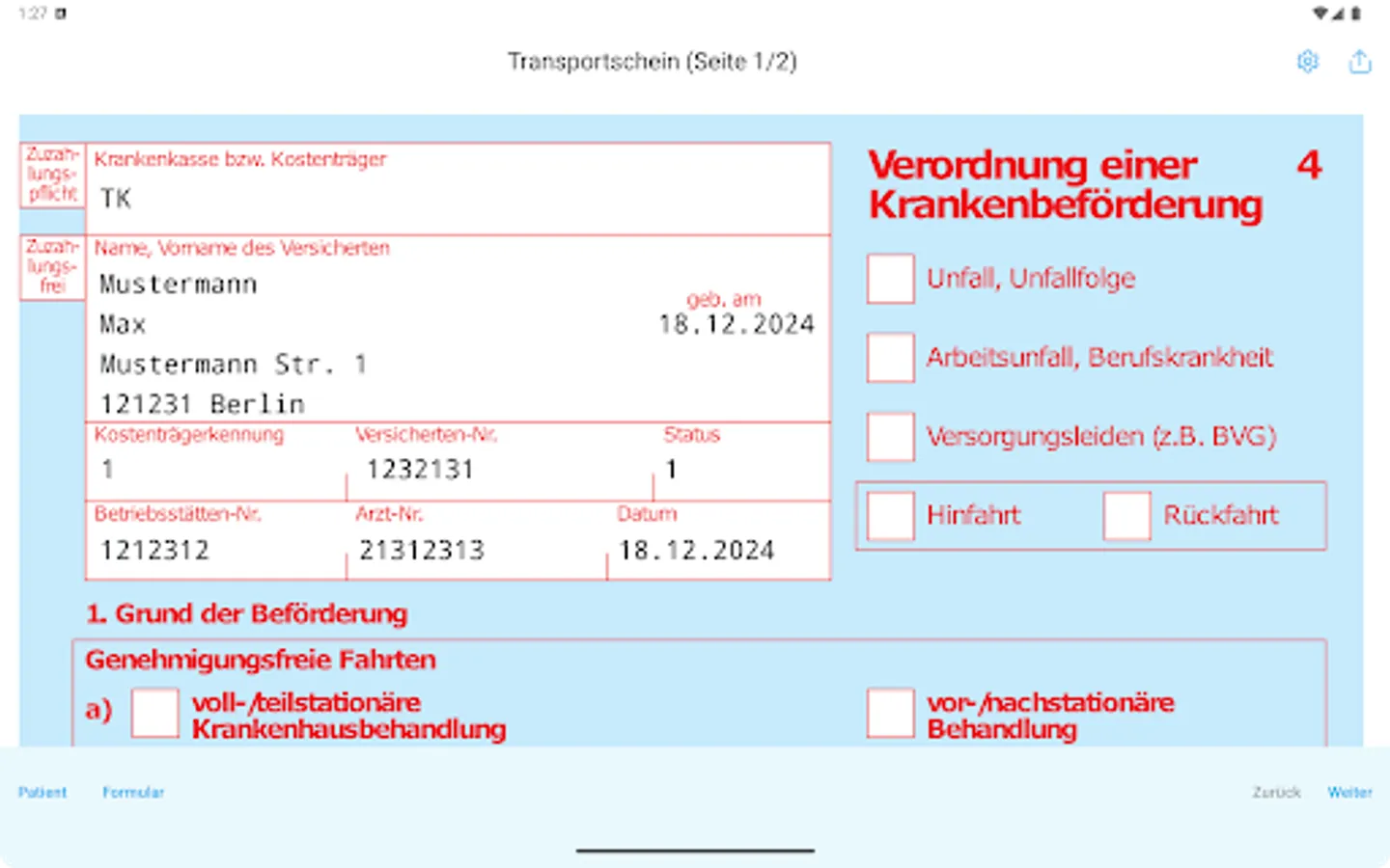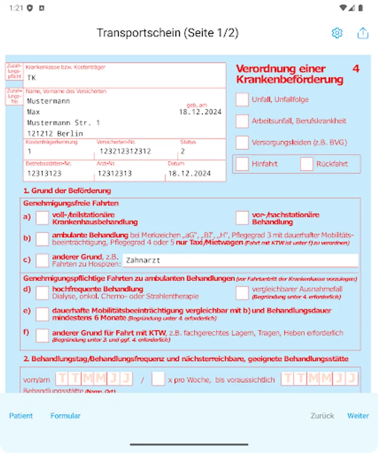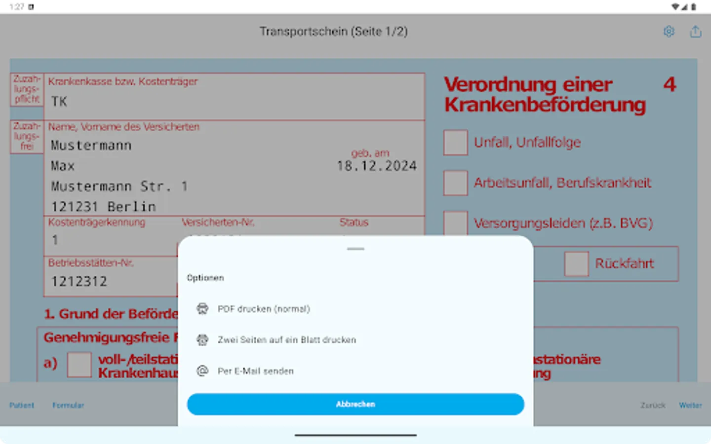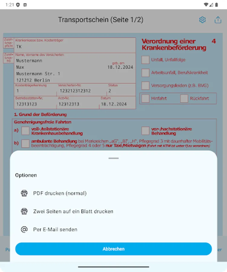 Once you have recorded all the information, you can create a transport note as a PDF. This contains all relevant patient and health insurance company data, which you can then print out directly or send by email. This means that the completed transport note can be forwarded directly to the responsible authorities or other medical facilities.