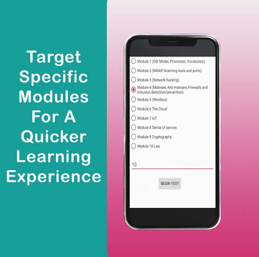 Each Module has its own group of questions so its easy to test your self and find any weak area's.