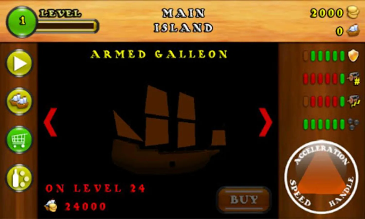 Discover and conquer 24 areas with over 200 islands in this first campaign. Set sail with your pirate ship and enjoy epic battles! Earn coins by taking rest from battle while fishing and selling fish to your conquered island. Discover treasure islands to get golden treasure. Destroy and rob pirate and trade ships and sell stolen goods to you islands to earn some coins. Buy new stronger and faster ships while you advance. You can buy and upgrade cannons for 26 available ships and boats at the market.