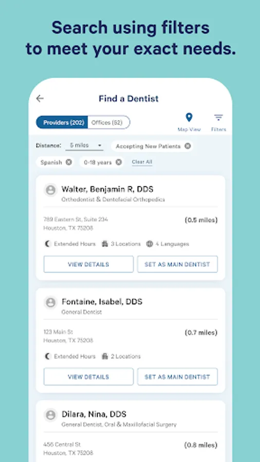 Locate a dentist you’re already familiar with or search for a new dentist in your area. You can filter results by office hours, language and those that are accepting new patients.