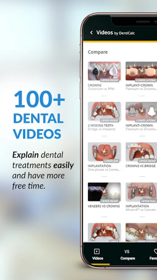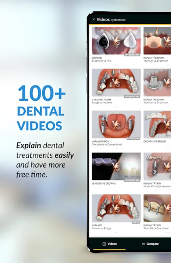 DentiCalc offers you 1000+ photos and 100+ state-of-the-art videos to help dentists explain treatments patients can easily understand. Tailored to your patients' needs, they are clear and focused to help make complex topics digestible. Use them and bridge the knowledge gap between your patients and you, their dentist.