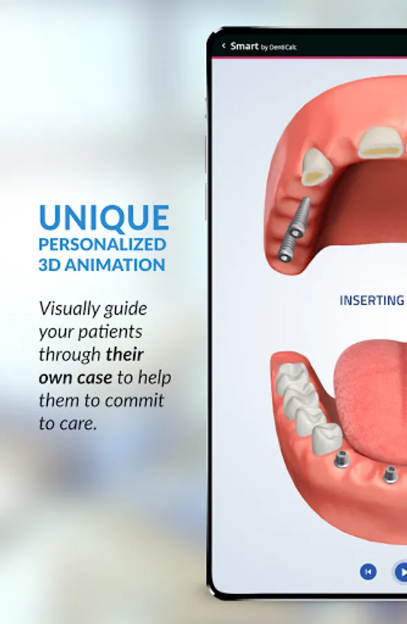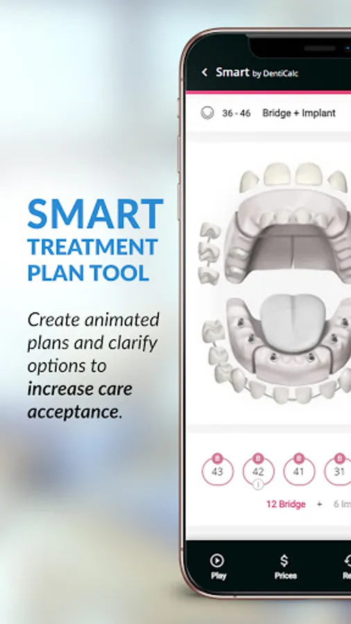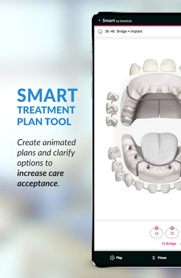With our industry-leading SMART dental treatment plan tool, it’s never been easier to show your patients everything they need to know about their dental issues, and demonstrate exactly how you'll treat them. With DentiCalc, you can effortlessly create and animate treatment plans in seconds. Use it to enlighten and visually guide your patients, clarify different treatment options and consult prices chairside.