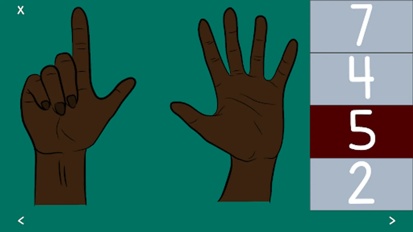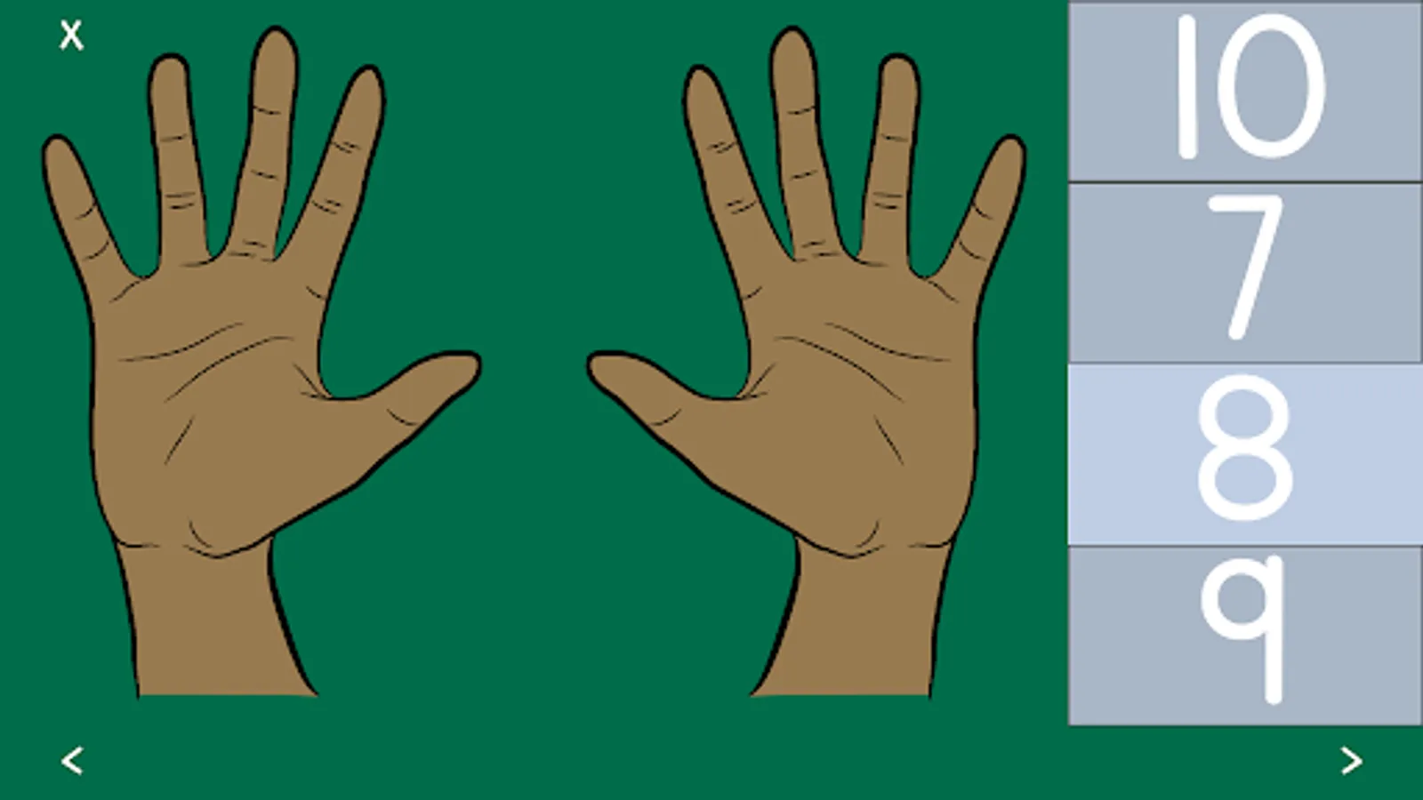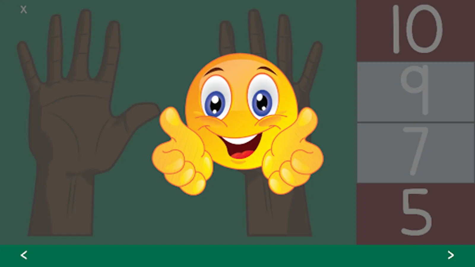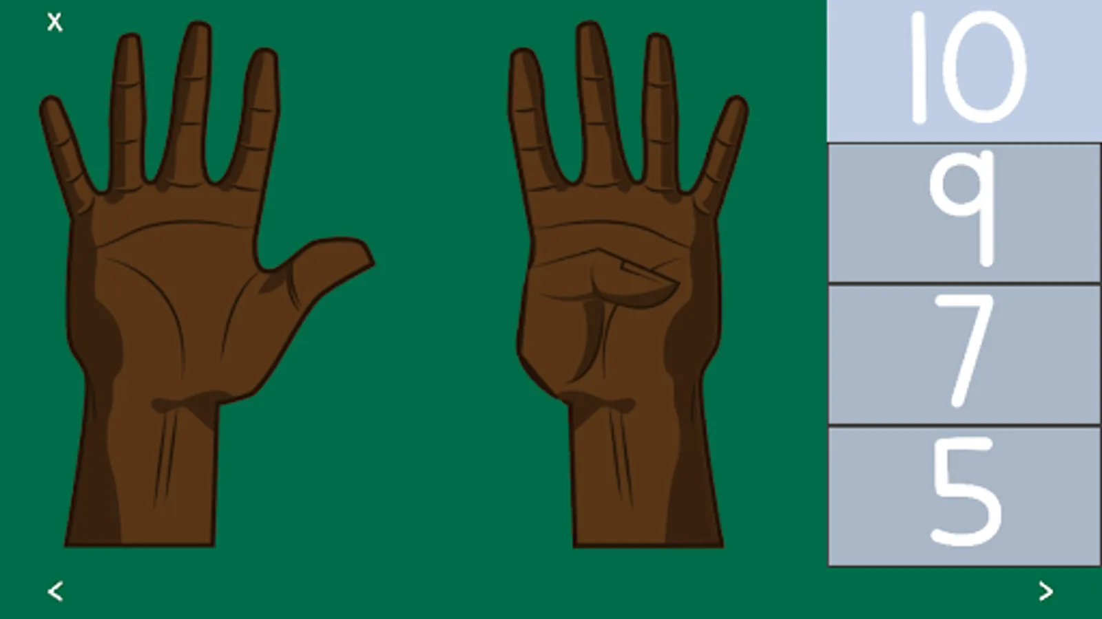 The levels start with counting and recognizing numbers on one hand, and progress slowly to two hands. Shortly, the child will learn to add and subtract using fingers as their tool. In the end, children will be able to recognize numbers quickly, add with two hands, and subtract.