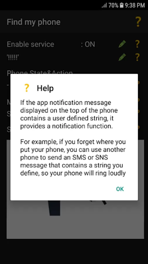 E.g. user defined string: '###', message received on SMS or SNS app: '### phone' = > notification action)
