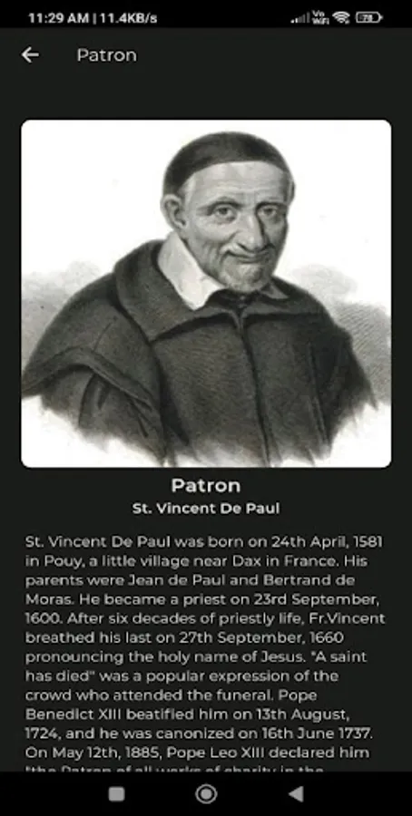 St. Vincent De Paul was born on 24th April, 1581 in Pouy, a little village near Dax in France. His parents were Jean de Paul and Bertrand de Moras. He became a priest on 23rd September, 1600. After six decades of priestly life, Fr.Vincent breathed his last on 27th September, 1660 pronouncing the holy name of Jesus. "A saint has died" was a popular expression of the crowd who attended the funeral. Pope Benedict XIII beatified him on 13th August, 1724, and he was canonized on 16th June 1737. On May 12th, 1885, Pope Leo XIII declared him "the Patron of all works of charity in the Universal Church".