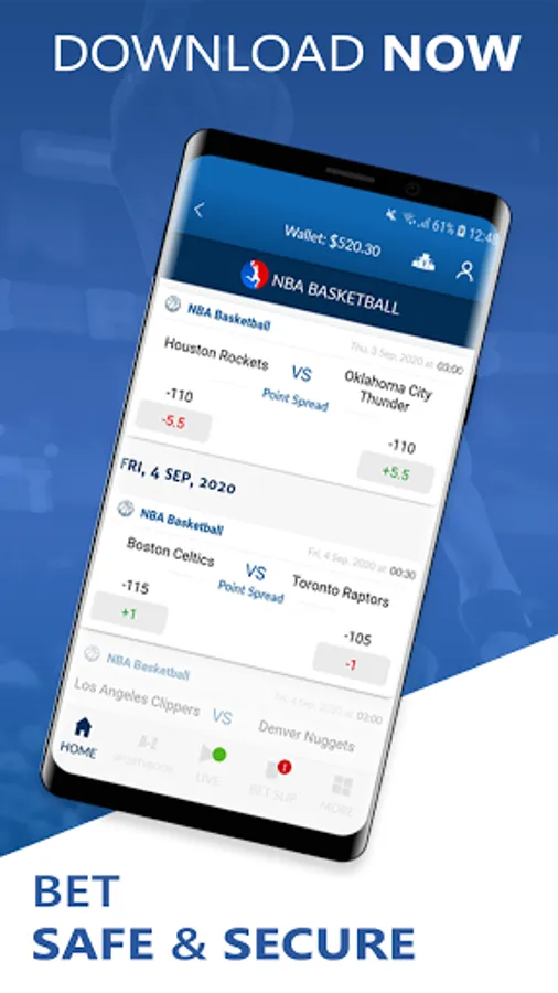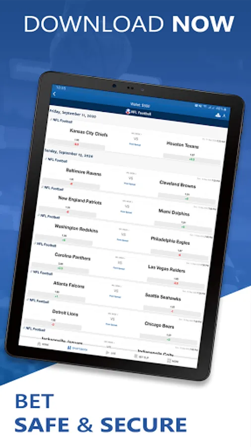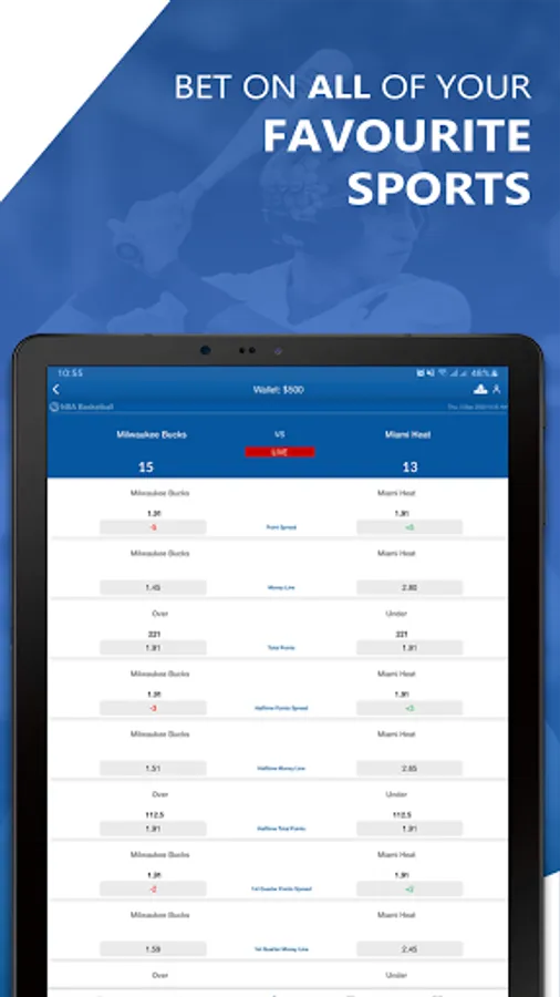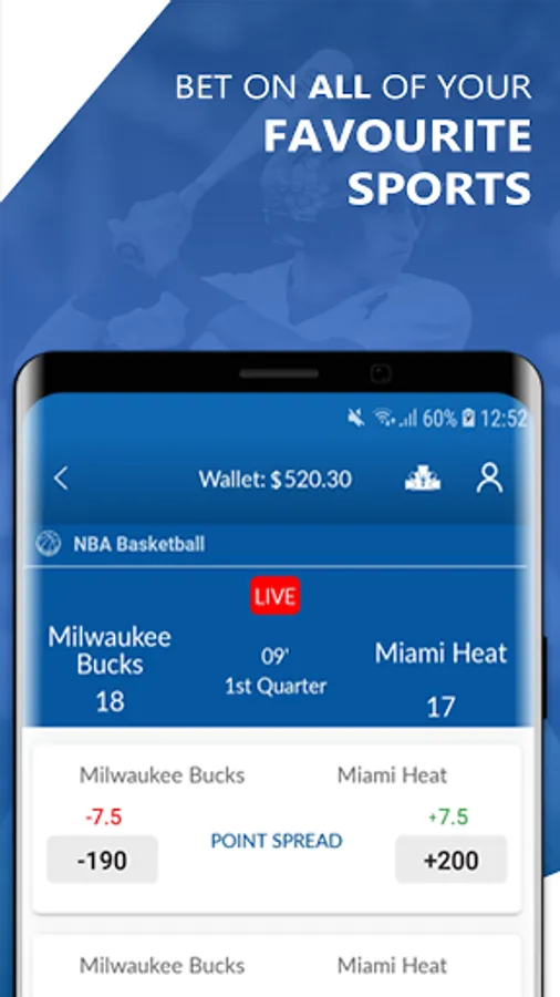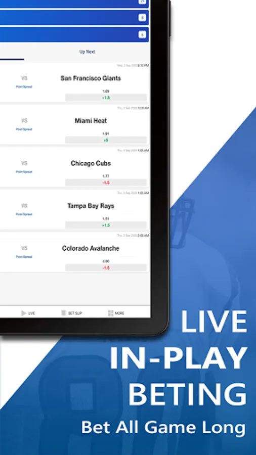 Experience the thrill of Sport Betting™ on ALL MAJOR SPORTS including Football, Baseball, Basketball, Hockey, UFC, Soccer, Tennis, Golf, Boxing, Racing and more. The original Sports Betting™ App Sportsbook brings you real time Las Vegas Odds, reduced juice (low vig), multiple betting options (Parlays, Straight, Teasers and Props) and even Live Betting (All Game Long).
