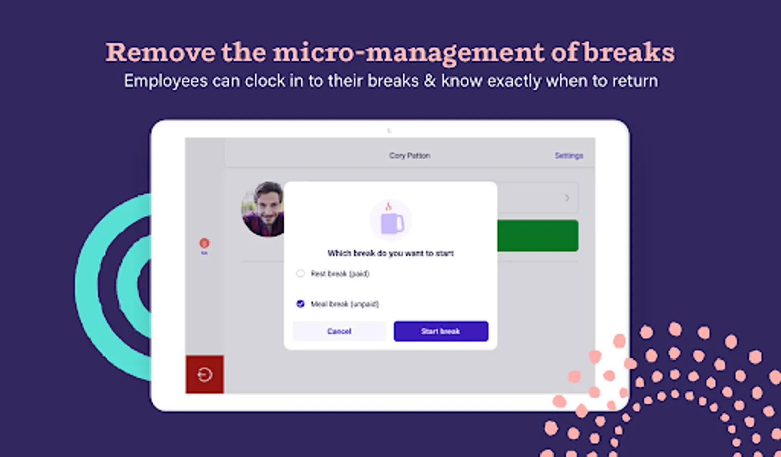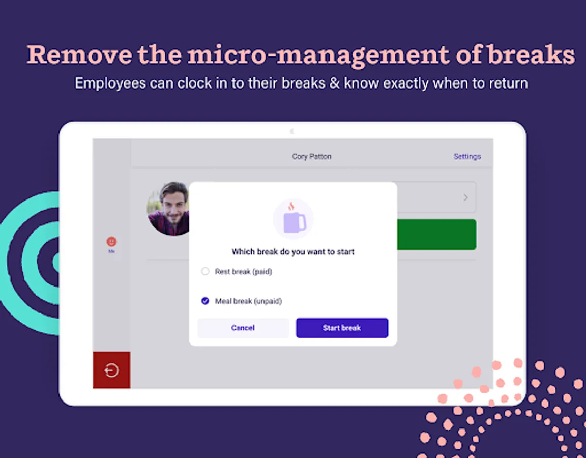 ✅ Ensure staff take their meal & rest breaks — Keep your team at their best and protect your business from compliance risks. Our time clock app helps employees take the right breaks — and will alert managers when breaks are missed altogether.