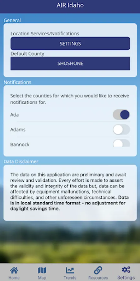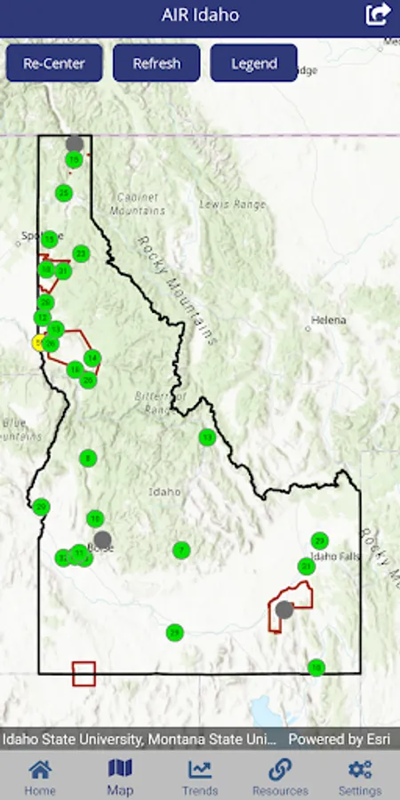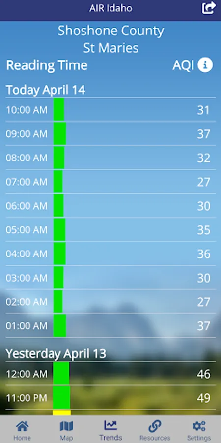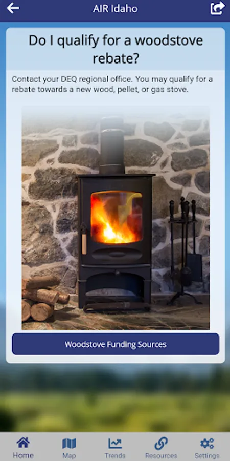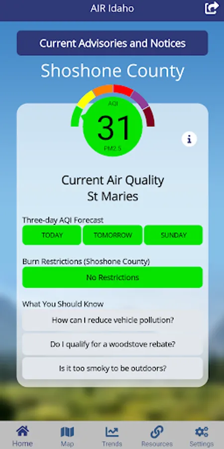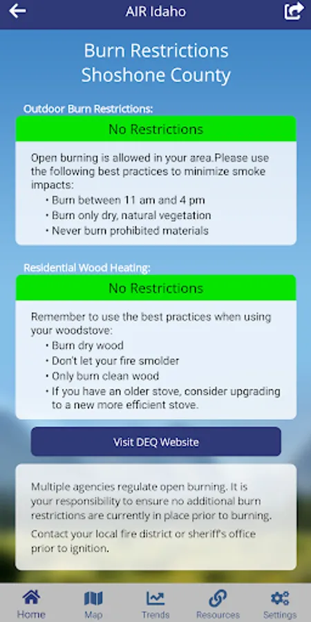 The Idaho Department of Environmental Quality’s (DEQ) AIR Idaho app provides forecasted and real-time air quality information. The app displays current air quality data, air quality forecasts, open burning restrictions, and tips on how to protect the air and your health. Enable notifications to receive information on local air quality advisories and burn restrictions. Display air quality data by choosing a county or enabling location services.