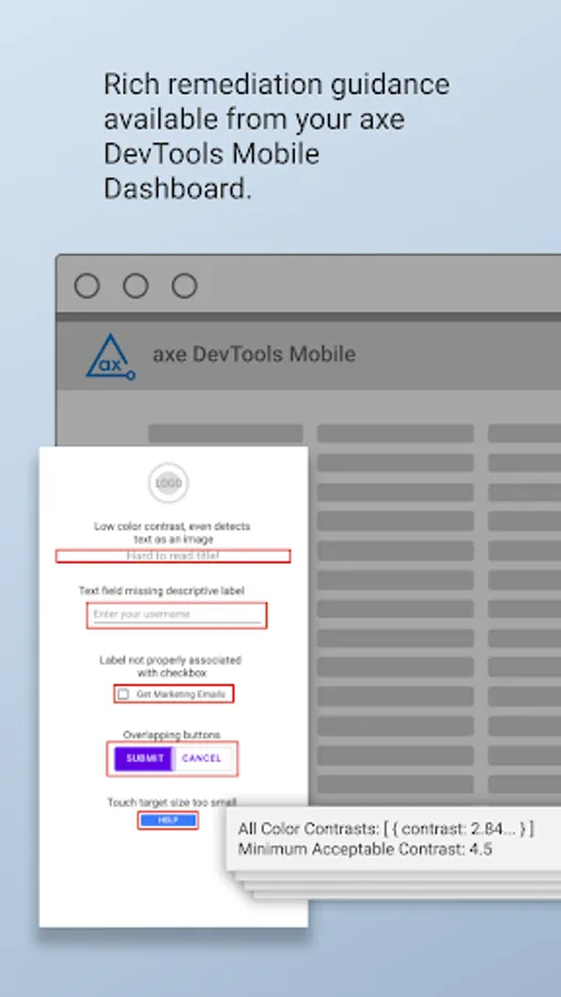 Initiate your own scans whenever you’d like. Get clear explanations of issues found along with accurate remediation advice. Use the mobile dashboard to share and organize your results, get an accessibility score, and dig into detailed results which include the captured view properties.