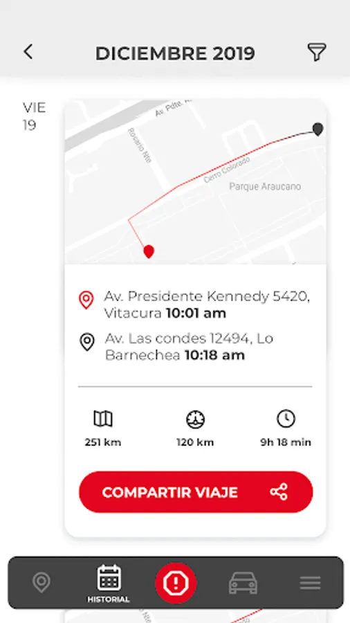 With Derco Smart Sensor you can keep track of all your trips, knowing the distances traveled, maximum speed, cost in fuel and the time spent on each trip. You will also have the option to share your trips with whoever you want.
