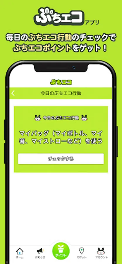 We randomly inform you of "Buchi Eco Behavior", which is useful for eco. Let's "check" so that you can actually work on it, expand your interests, and connect it to your own actions! Get Buchi Eco Points by "checking" once a day!