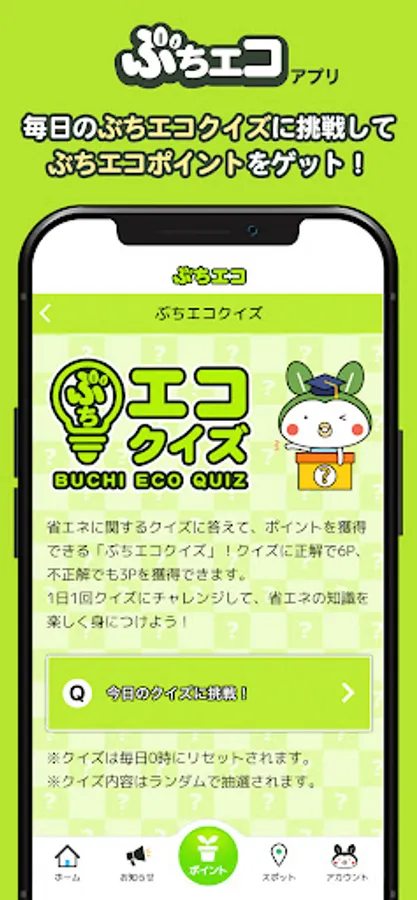 "Buchi Eco Quiz" where you can answer eco-related quizzes and earn Buchi Eco Points! Take a quiz once a day and enjoy learning about eco!