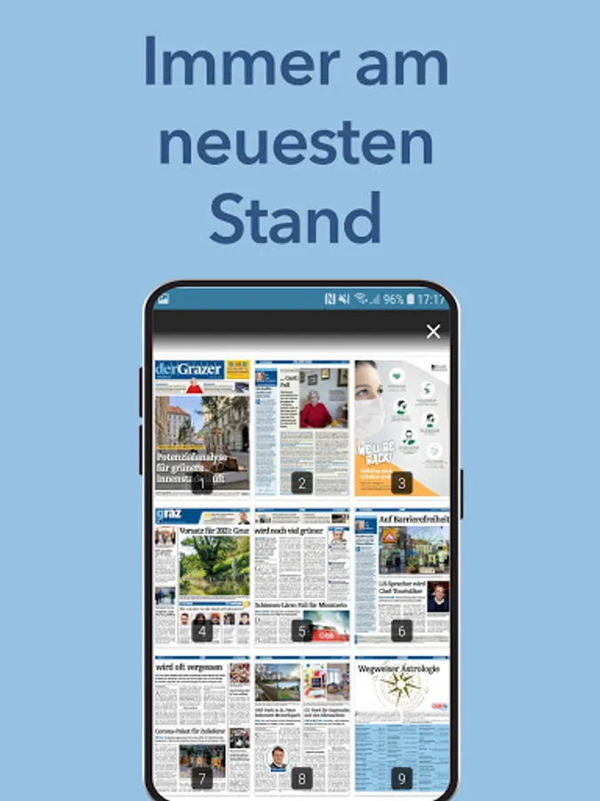 The “Grazer” app guarantees various user-friendly reading views. A simple swipe on the device takes you to the next page. The individual articles and photos can easily be enlarged. You can quickly jump to the desired page of the e-paper via the table of contents and the page overview.