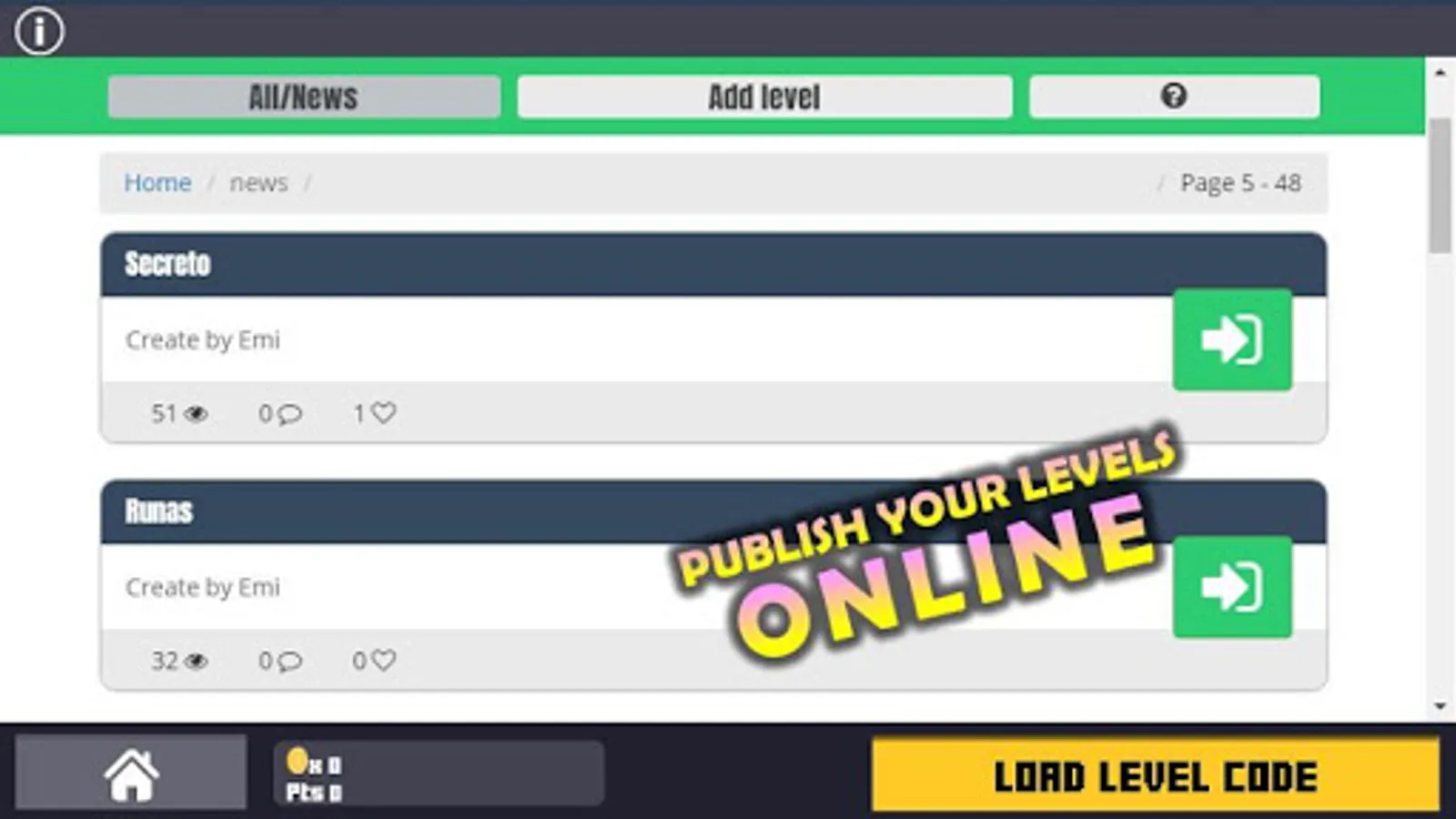 Here you can publish your levels and also play levels made by other players from all over the world.
