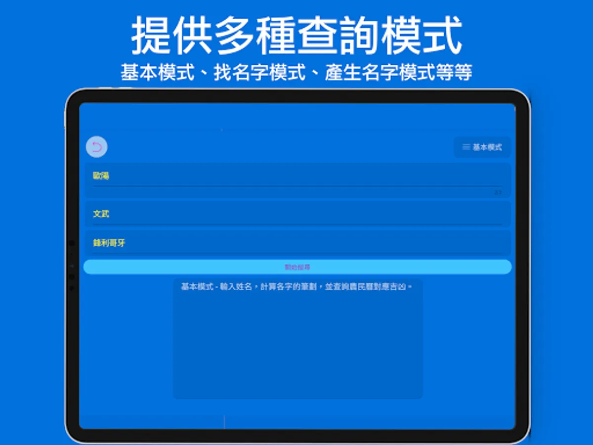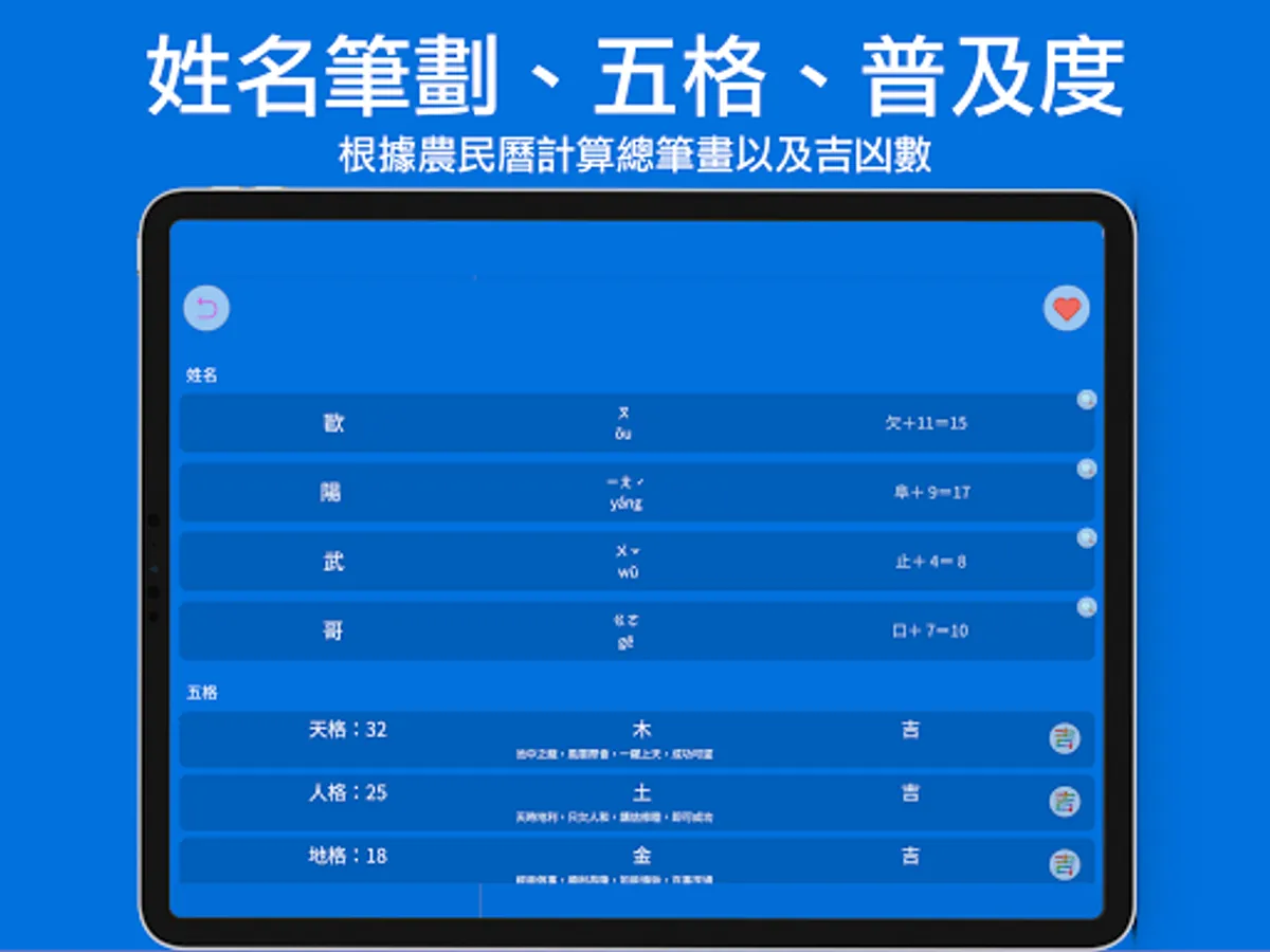 This is the most convenient tool for naming newborn babies. It provides a small software for Chinese characters Kangxi strokes, and calculates the total strokes of each name and the final number of good and bad luck according to the farmer’s calendar. There are three modes.