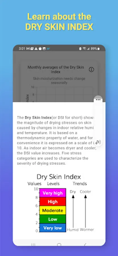 The Skin Sim app provides an estimates of the Dry Skin Index, which represents the external stresses on skin due to changes in both indoor temperature and relative humidity.