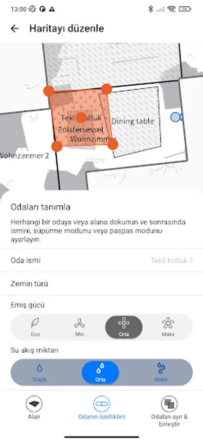 Assign a floor type to rooms or areas in the app. DERSAR ROBOT recognizes when its water tank is attached and automatically avoids areas that have been defined as carpet.