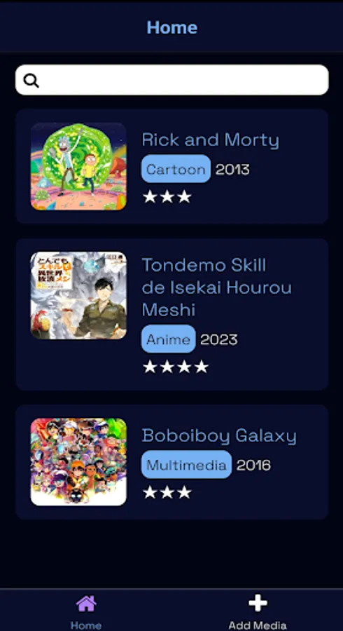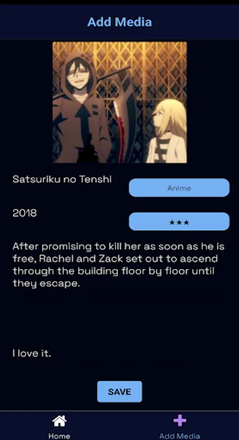 All you have to do to add a media, is tap on the plus sign on the right of the bottom navigator; which will bring you to the "Add Media" screen. There, you may fill out all the necessary information of your media of interest. After that, you can tap on the "SAVE" button to save it. Navigate back to the "Home" Screen and voila! Your media has been noted!