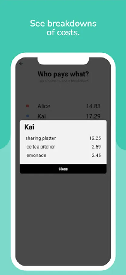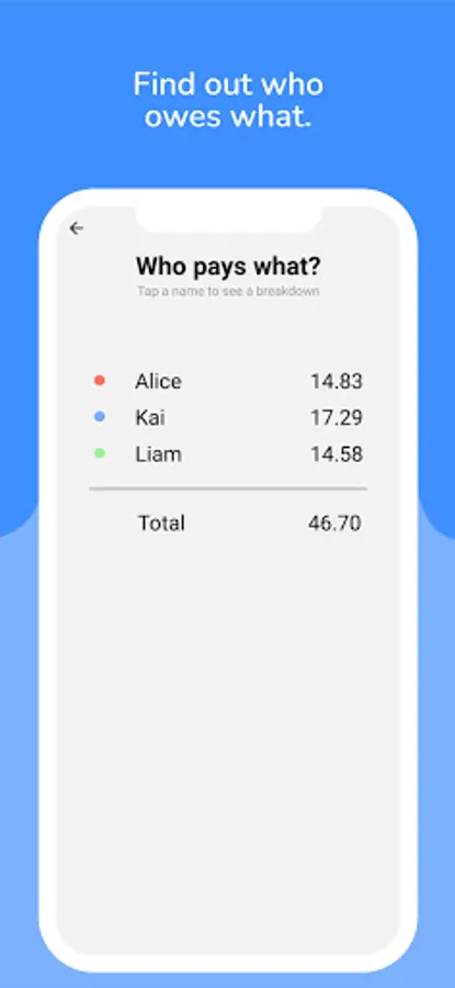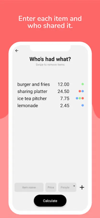 Enter who's splitting, each item and who shared it, hit calculate and get an instant breakdown of who owes what.