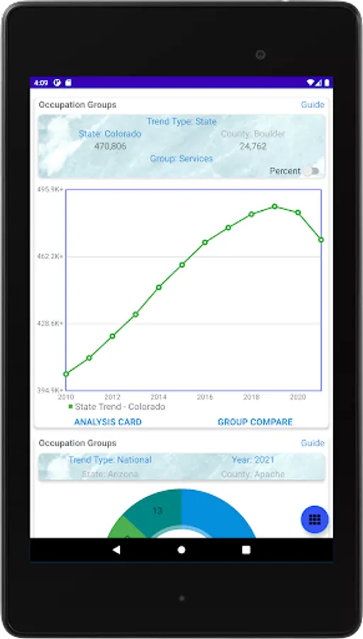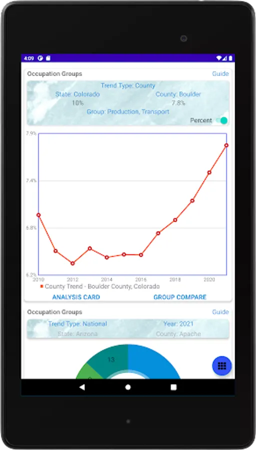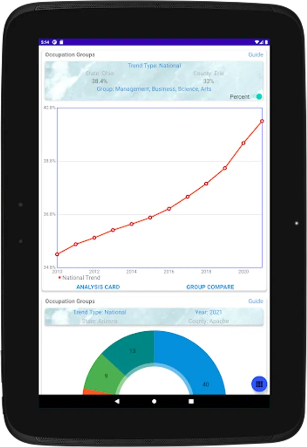 To access the free version of the Data Fidget app simply download the app from google play. The Free Version allows you to map the above datasets by state and create line graphs for national, state and county geographies throughout the United States. From the national maps you can view different years and for grouped datasets you can view the data in a count or percentage format. Using the custom map symbology you can quickly identify spatial trends and compare the highest values to the lowest values. From the line graph you can generate an annual line chart going back to 2010 for the nation or any state or county as well as use the compare tools to quickly compare national, state, and county annual trends.
