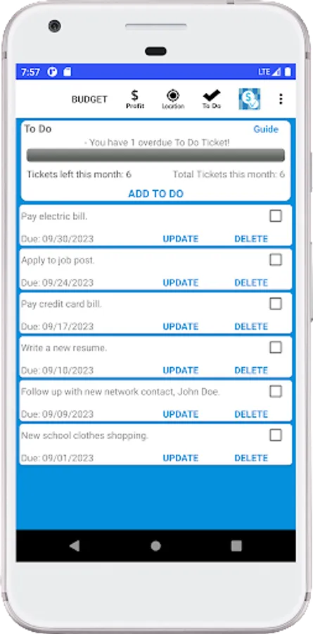 Use the To Do Ticket page to record tasks that can help you pay bills on time and keep ideas fresh on your mind.