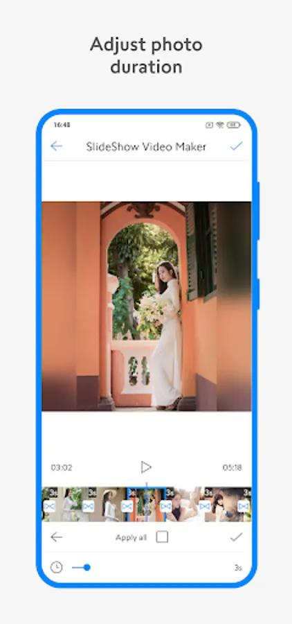 - You can customize the video duration, the transition duration between two images as long or short as you want.