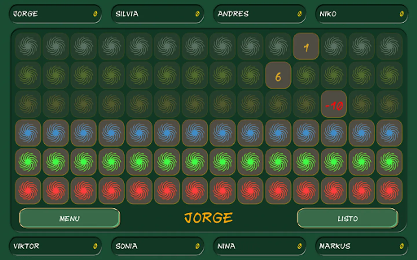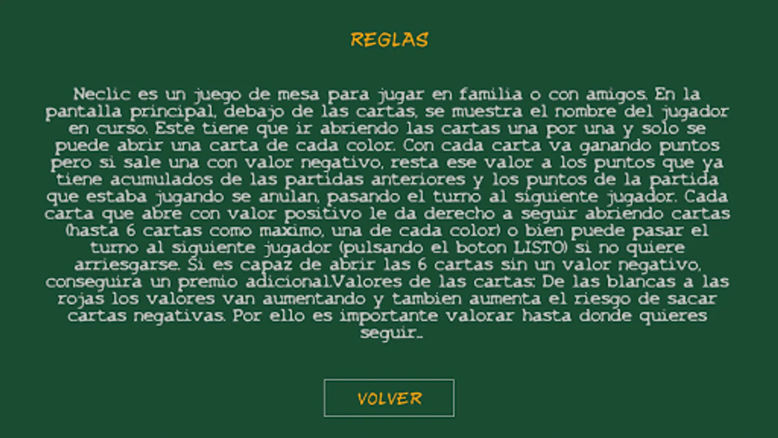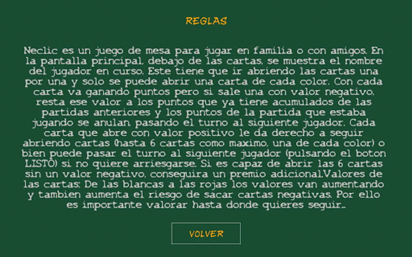 Neclic numbers game for familia.Los game players have to open the letters and thus are gaining points, behind each card a positive number or negativo.Si hides the player opens a menu with positive value can continue to open up to six cards (one of each color), points will be added to open six letters or if the player does not want to risk more and press the Done key, if the player opens for example 4 cards and to open the fifth you get a negative number the player loses the point of this game and subtracted from their points won the negative value of the card abierta.Si the player manages to open the six cards will be added every point of this game and a prize extra.Las white cards are more there is only one safe behind them negative and 13 positive, but white letters give little reward can draw maximum 5 puntos.Desde white letters to the red cards reward but the risk is also increasing so the player must decide whether to risk or going slowly opening the safest colors and pass the turn to the next player.