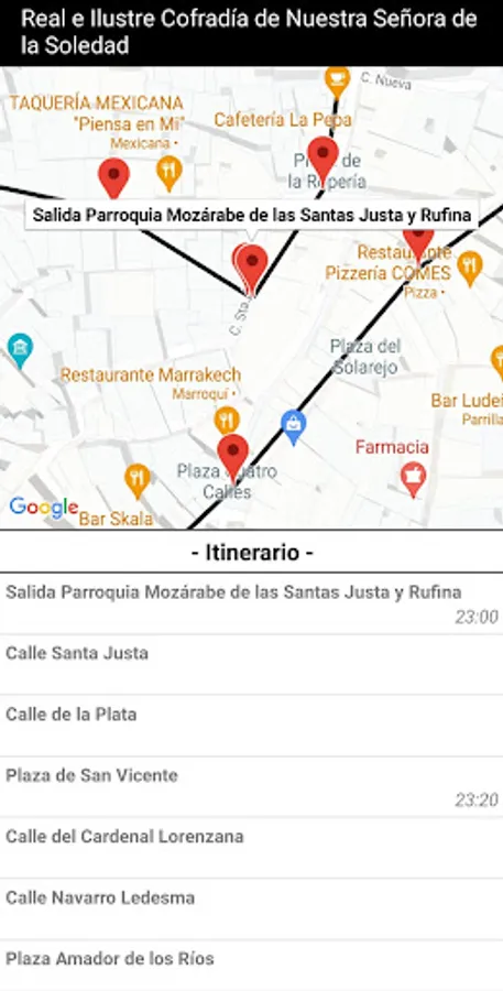 In the list of Processions you will be able to consult a list of the different days in which there are Processions and access the information of the different Processions, consult the estimated times of passage at the different points and locate the procession on the map.