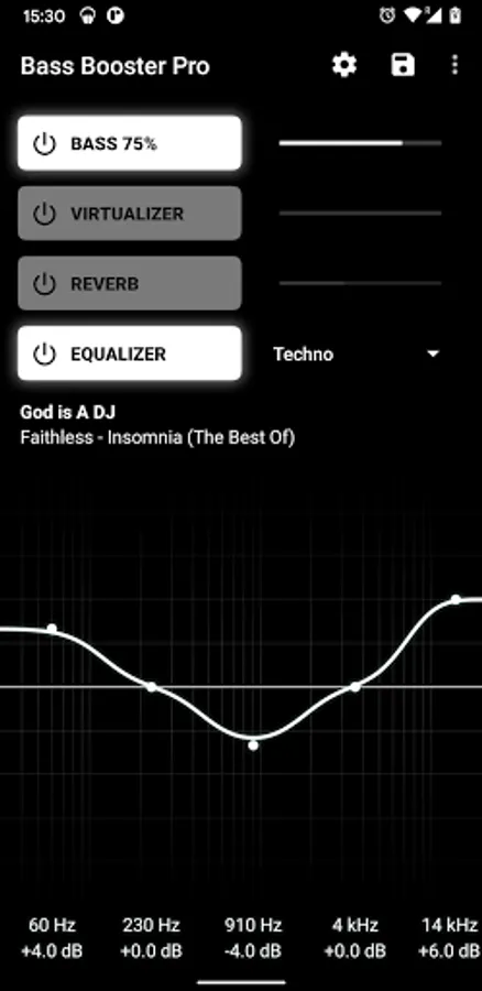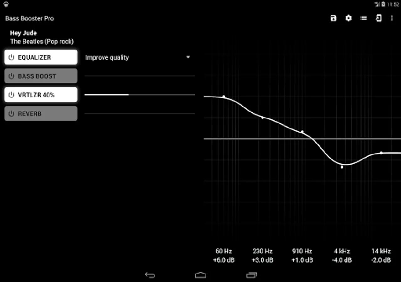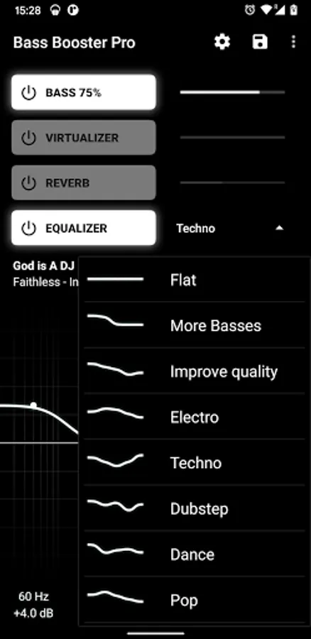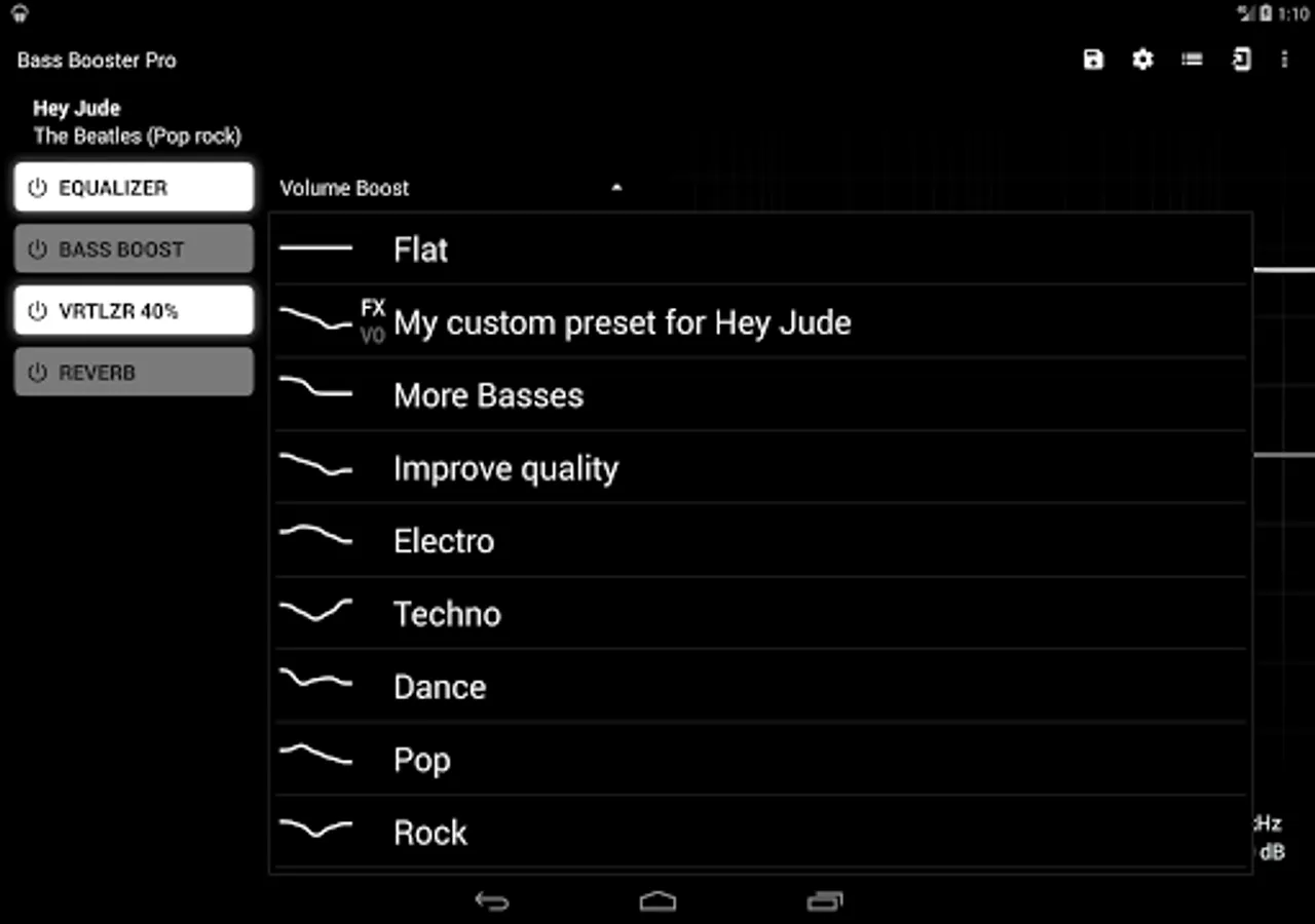 More Basses, Improve quality, Electro, Techno, Dubstep, Dance, Pop, Rock, Metal, Reggae, Rap, R&B, Hip-Hop, Jazz, Latino, Acoustic, Classical, Party, Voice Boost, Volume Boost. (included in the free version)