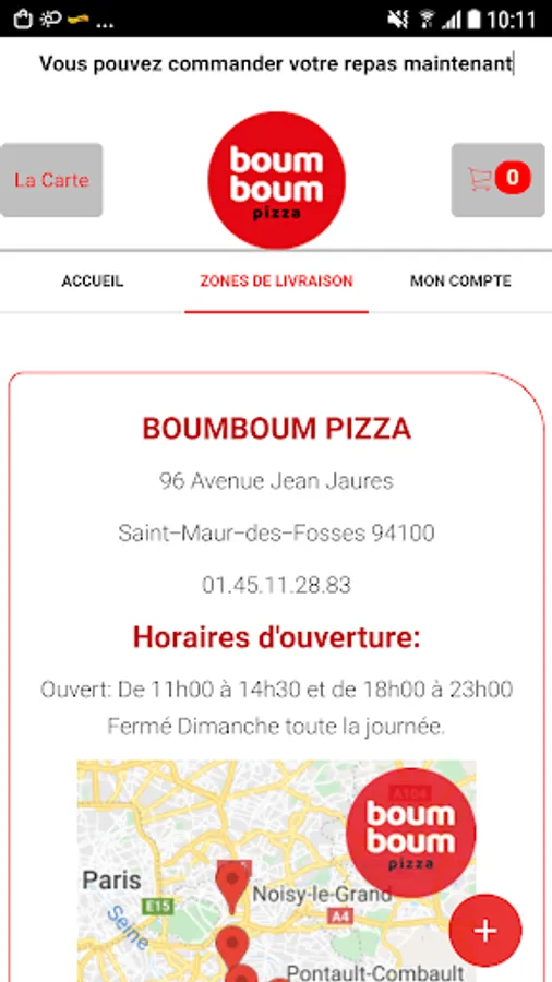 The BOUM BOUM PIZZA Android application allows you to order online or by phone via your application. You can consult our menu and choose your products.