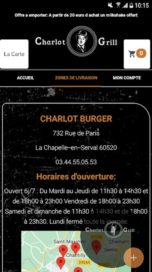 The CHARLOT BURGER Android application allows you to order online or by phone via your application. You can consult our menu and choose your products.