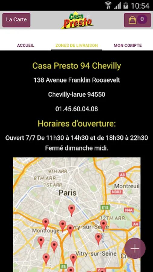 The Android Casa Presto 94 Chevilly application allows you to order online or by phone via your application. You can consult our map and choose your products.