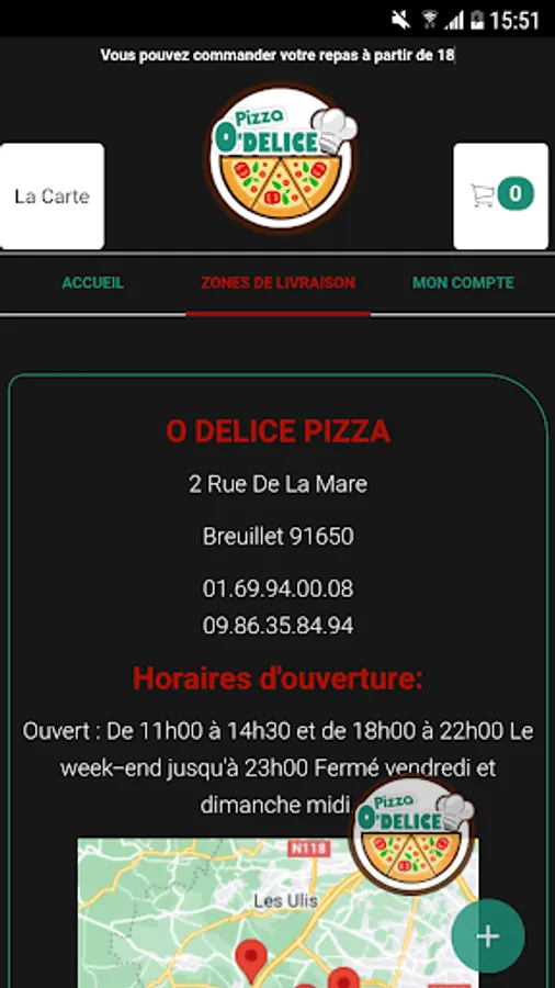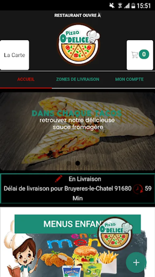 The O DELICE PIZZA Android application allows you to order online or by phone via your application. You can consult our menu and choose your products.